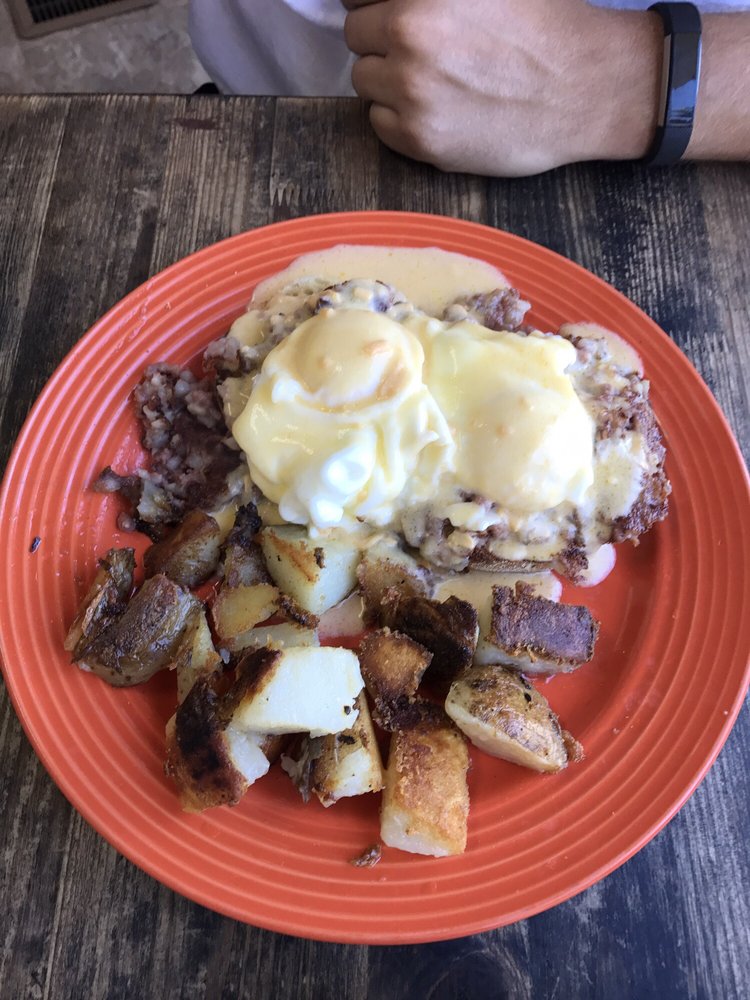 English muffins topped with corned beef hash, 2 poached eggs and our special hollandaise sauce. Served with home fries.